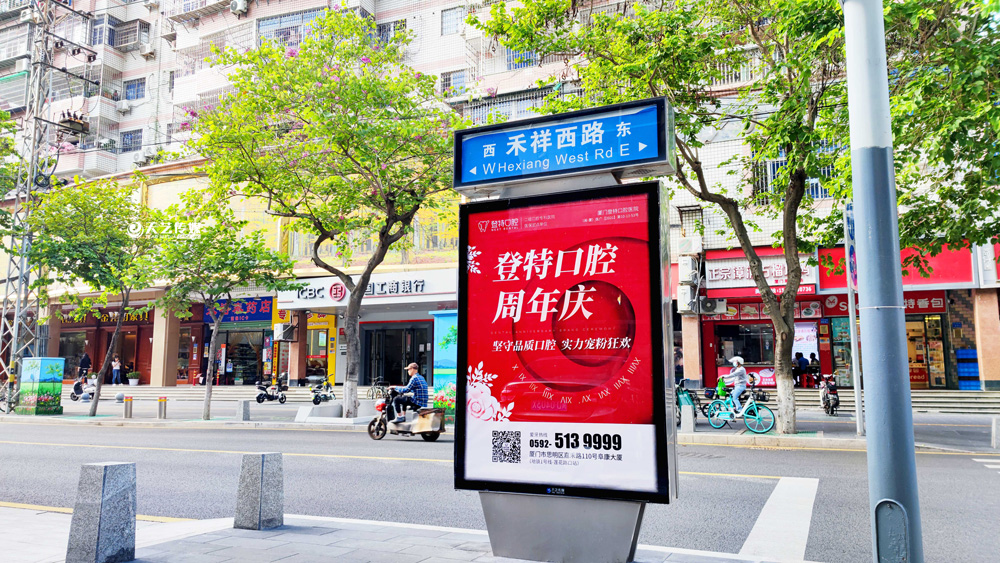 同時,廈門登特口腔繼續(xù)與廈門天藝傳媒合作,投放鷺島全城超200座城市路名牌,覆蓋島內(nèi)各大交通主干道(如嘉禾路、禾祥西路、禾祥東路)、核心商圈、商務(wù)區(qū)寫字樓林立區(qū)、人流車流覆蓋密集區(qū)域。